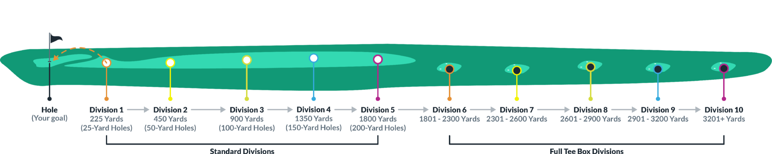 Transfer these skills to the golf course and level up during 9-hole playing tests with your instructors and fellow students. A score of 36 or less will move you into the next division to further challenge you and deepen your proficiency.